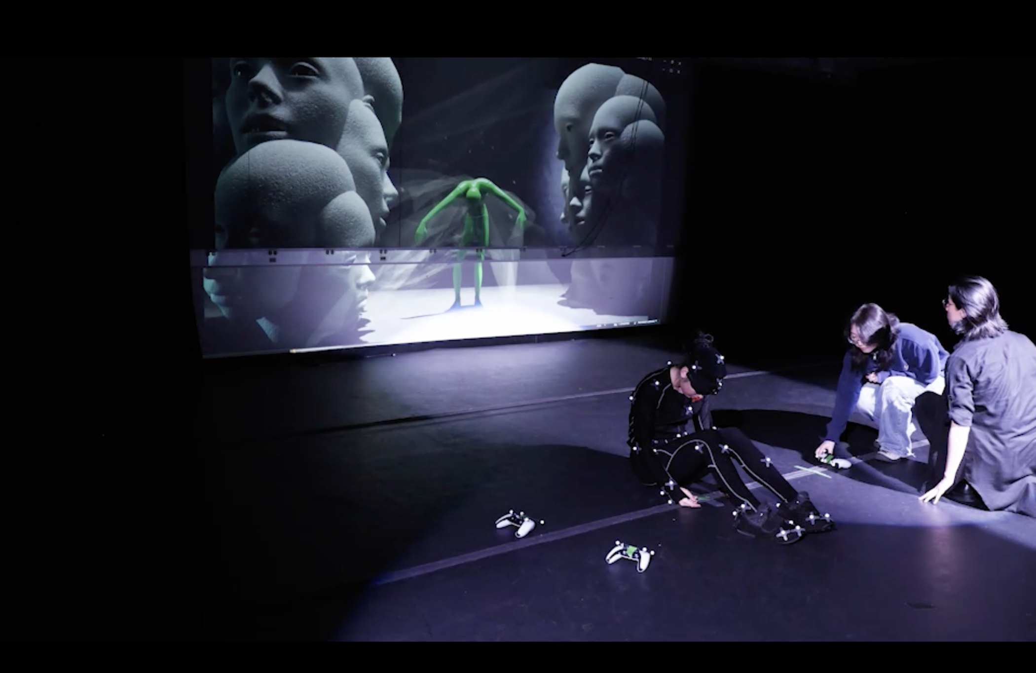 In this rehearsal, my movement is tracked while collaborators operate game controllers offstage. Every input, whether a button press or a joystick tilt, triggers a shift in the virtual camera or the avatar’s behavior. I design specific choreographic tasks to make these shifts visible on both my physical body and its digital double. This setup lets me test how external technical inputs redistribute agency and control within the performance system, turning the body into a site of negotiation between human intent and hardware intervention.